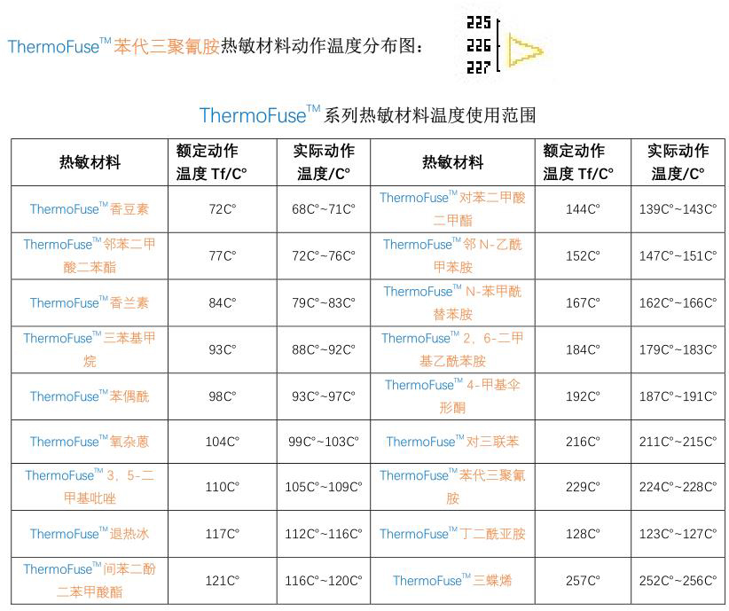 典型應(yīng)用該熱敏材料制作的溫度保險(xiǎn)絲特征數(shù)據(jù)(艾默生 G4 MICROTEMP 系列):